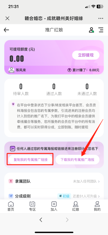 3、必须开通“推广红娘”功能,使用专属推广码或者推广链接,推广来的有效注册会员!